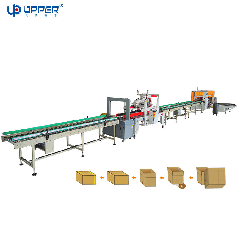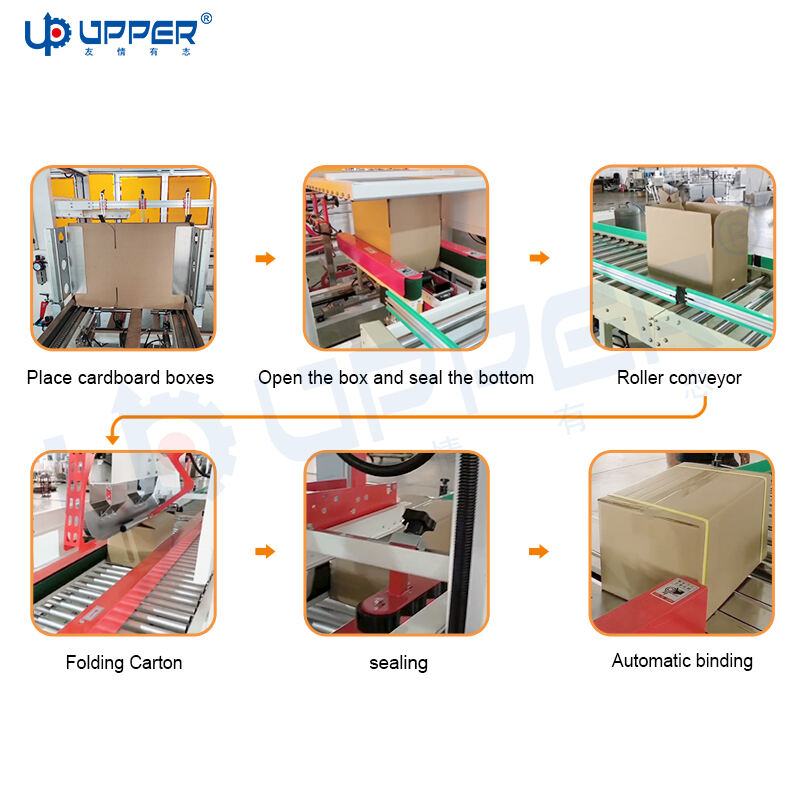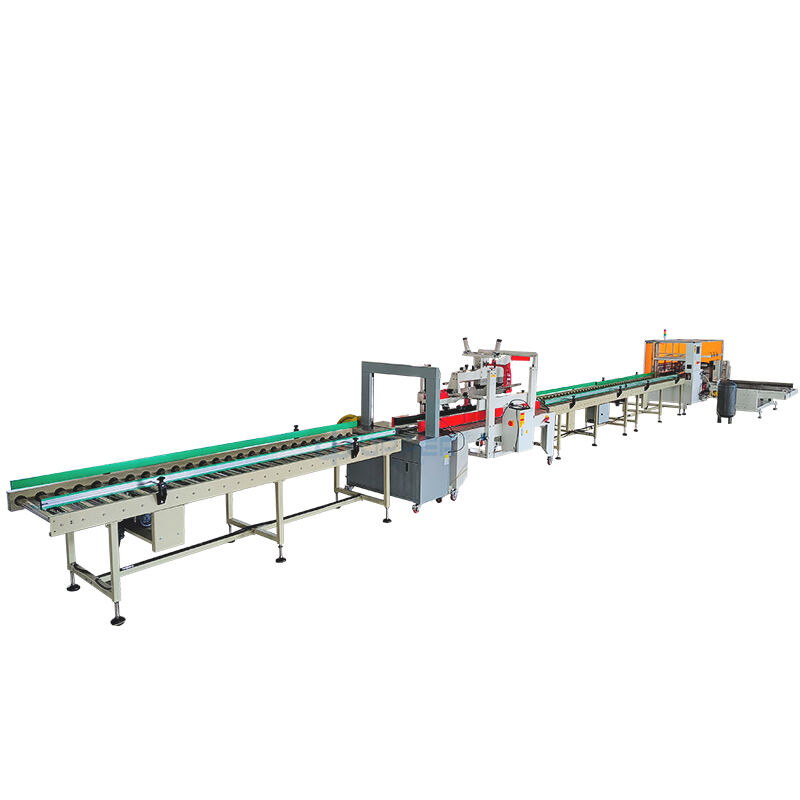 This is a Automatic case erecting, sealing and bundlind packaging line.This device is suitable for packaging various types of cardboard boxes, using a roller conveyor belt that can adapt to multiple sizes of cardboard boxes. It consists of three parts: automatic packing machine, automatic sealing machine, and automatic bundling machine, suitable for various industries and supporting non-standard customization.