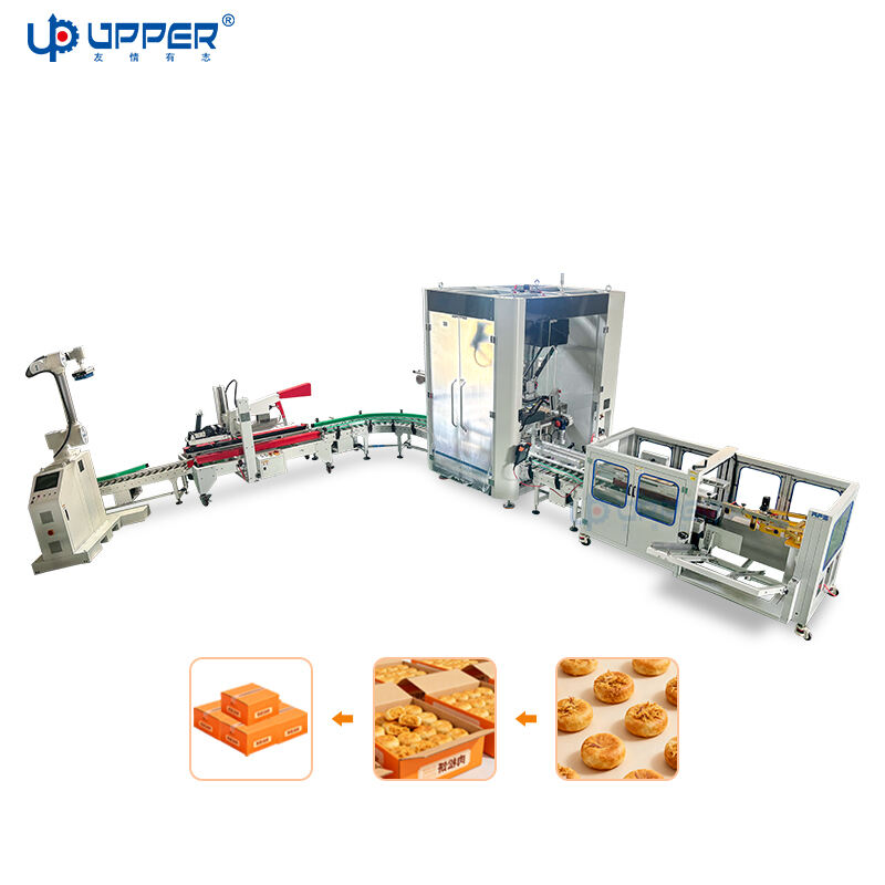 Dried meat floss cake fully automatic carton packing sealing, and palletizing system/Mooncake automatic collection, erecting, boxing, and palletizing machine