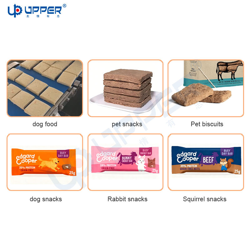 Questa è una linea di produzione per imballaggio a estrusione automatica di barrette per animali domestici a base di carne bovina e pollo. Dotata di macchina di taglio automatica e estrusore automatico, adatta per il processo di estrusione e taglio di vari prodotti farciti.