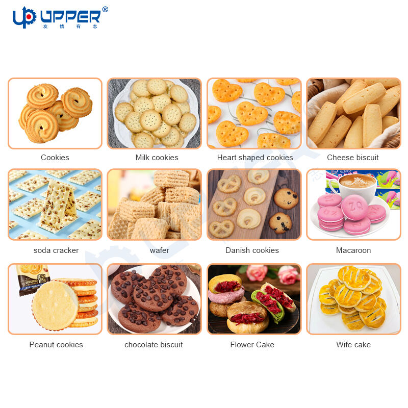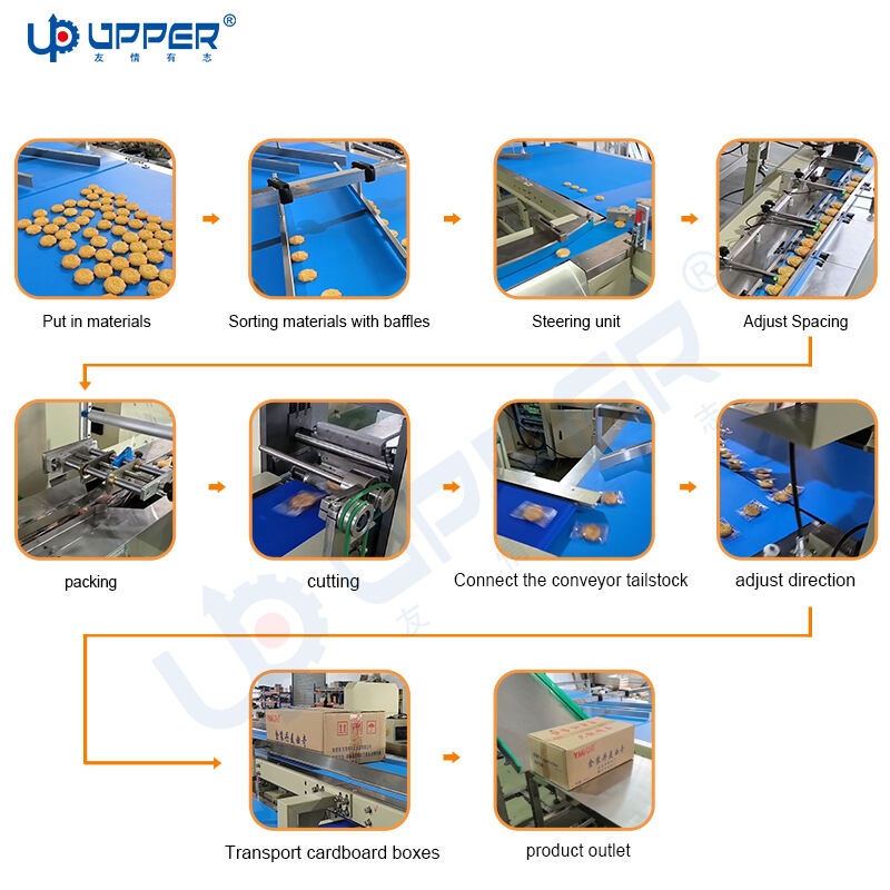 This is a One to two automatic cookie Packaging line with feeding and box tail rack.Materials are placed and transported through the conveying unit, which is equipped with material baffles for sorting materials. The sorted materials are adjusted in direction by the turning unit, and then the material spacing is adjusted by the sorting unit before being packaged by the packaging machine. The packaged materials will be connected to the conveyor tailstock, which can organize and transport the packaged materials in an orderly manner, ultimately completing the process.