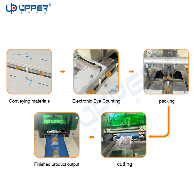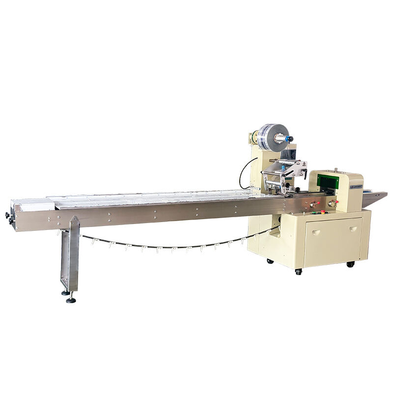 This is a cookie flow pack automatic packaging machine. Suitable for various small materials such as cookies, cleaning blocks, etc